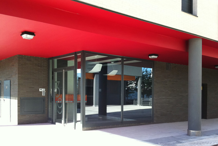 Instalación de barandillas de cristal en bajos de edificio de nueva construcción.